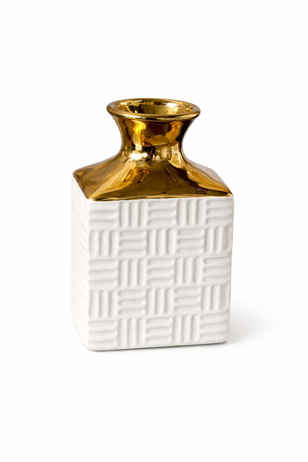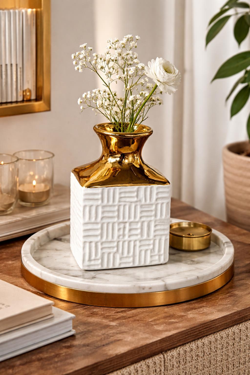 Florero decorativo ideal para realzar mesas, repisas o muebles auxiliares, aportando un toque elegante al ambiente.