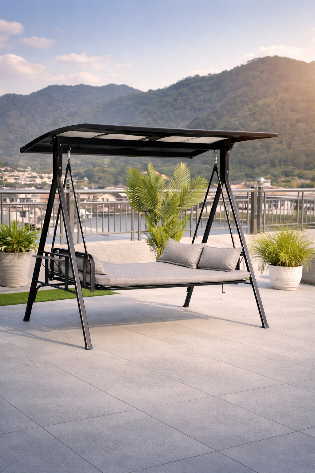 Silla cama colgante pensada para descanso y relajo, con un formato amplio que aporta comodidad y presencia visual al espacio.